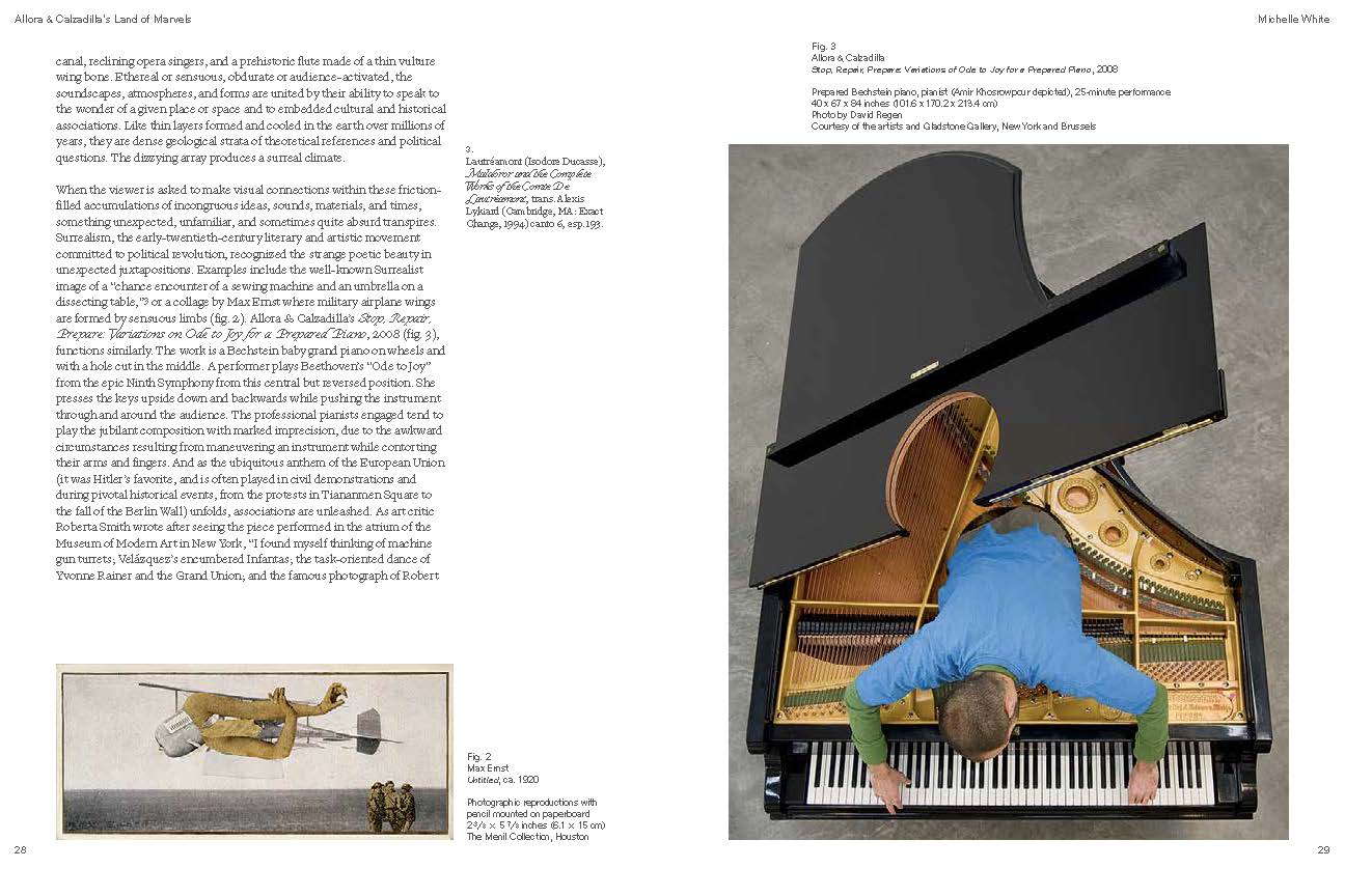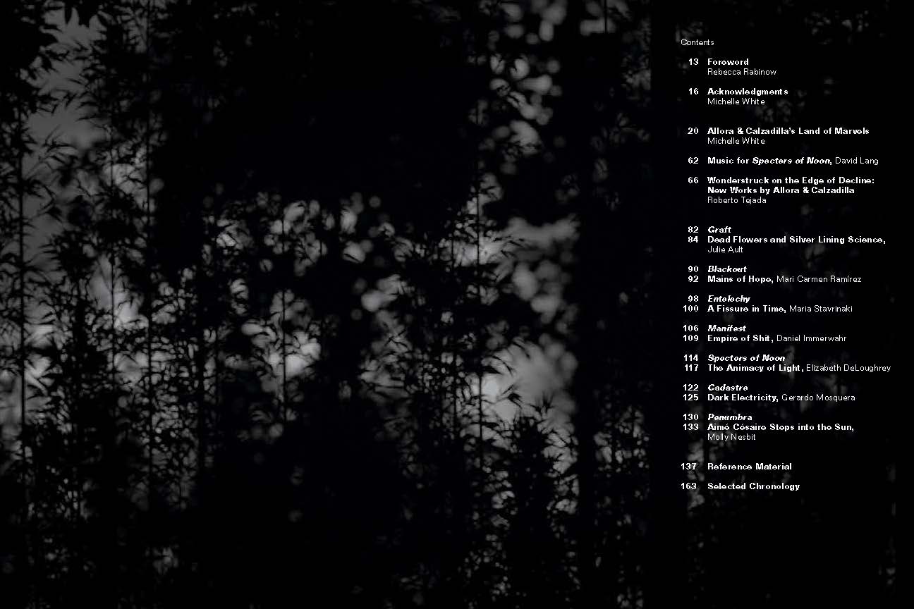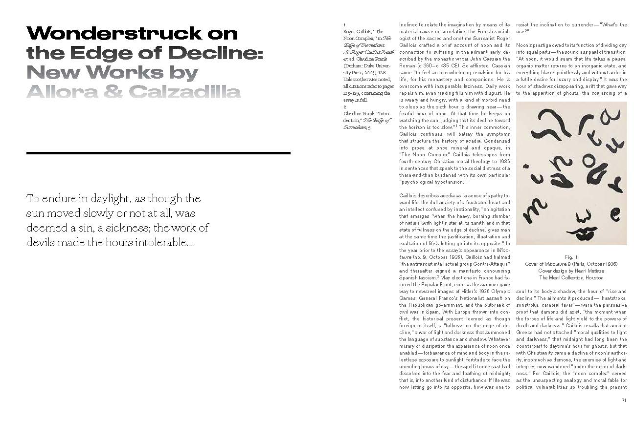 A book-length exploration of Jennifer Allora and Guillermo Calzadilla’s inspiration, production, and orchestration of seven conceptual works crafted for the Menil Collection’s exhibition Allora & Calzadilla: Specters of Noon. The Puerto-Rico based artists considered the Menil’s Surrealist holdings, the legacy of colonial politics in the Caribbean, the politics of power production, and the conditions of environmental instability—threads that converge around the idea of solar noon, when the day drags and inertia reigns.
