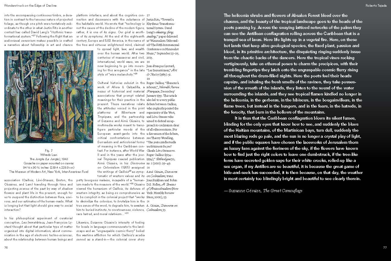 The book contains insightful essays by the exhibition’s curator, Michelle White, and art historian and poet Roberto Tejada as well as contributions on the individual artworks by Julie Ault, Elizabeth DeLoughrey, Daniel Immerwahr, Gerardo Mosquera, Molly Nesbit, Mari Carmen Ramírez, and Maria Stavrinaki, and by David Lang on his musical score. The dichotomy of light and dark can be seen in the carefully crafted design by Michael Worthington, and the installation is illustrated with sumptuous photography by Fredrik Nilsen. To complement the commissioned writings, the publication also includes texts that inspired the artists, writings and images by such varied authors as Roger Caillois, a fourth-century ascetic monk, poet Aimé Césaire, and the United States Congress (the Guano Islands Act of 1856).