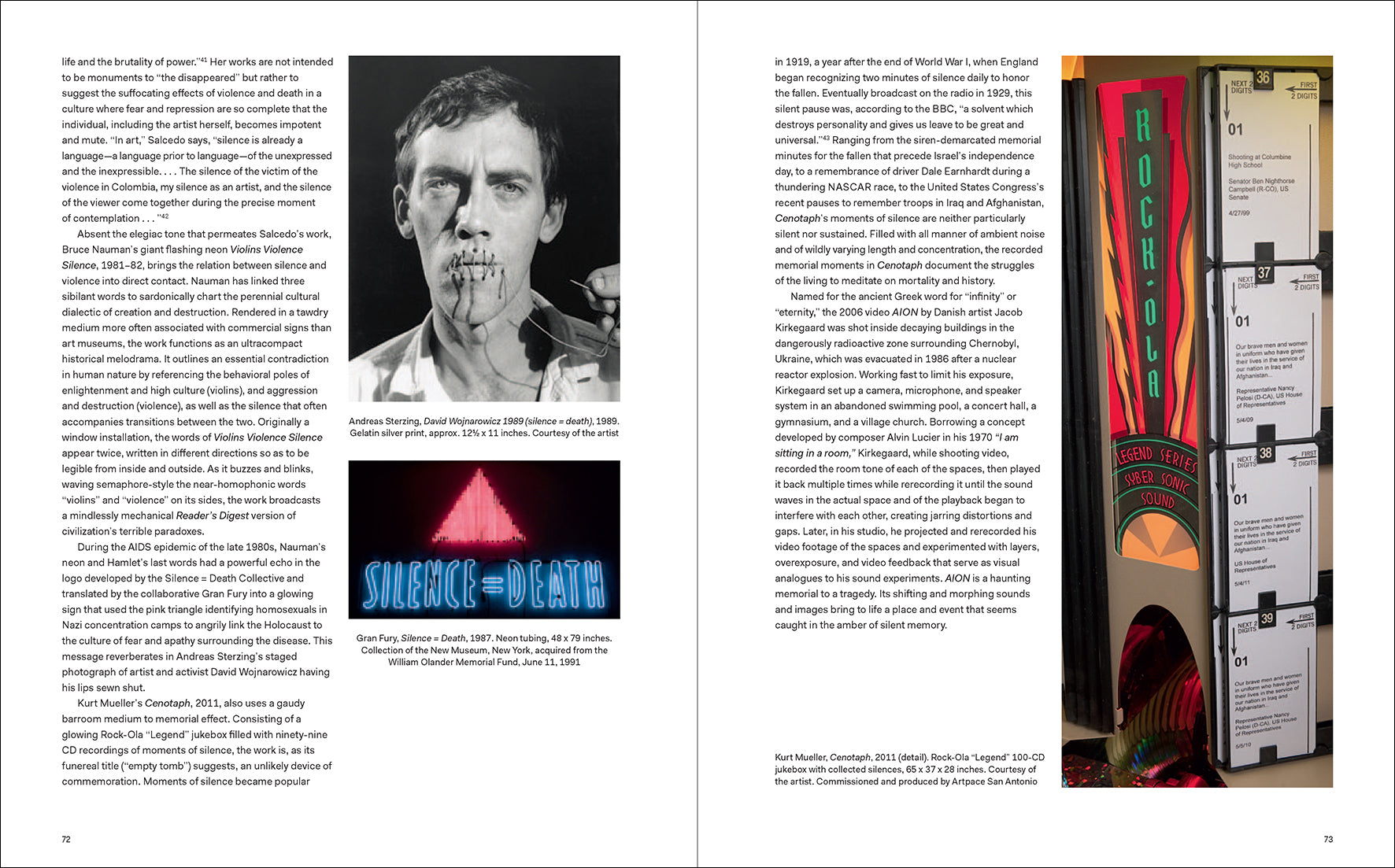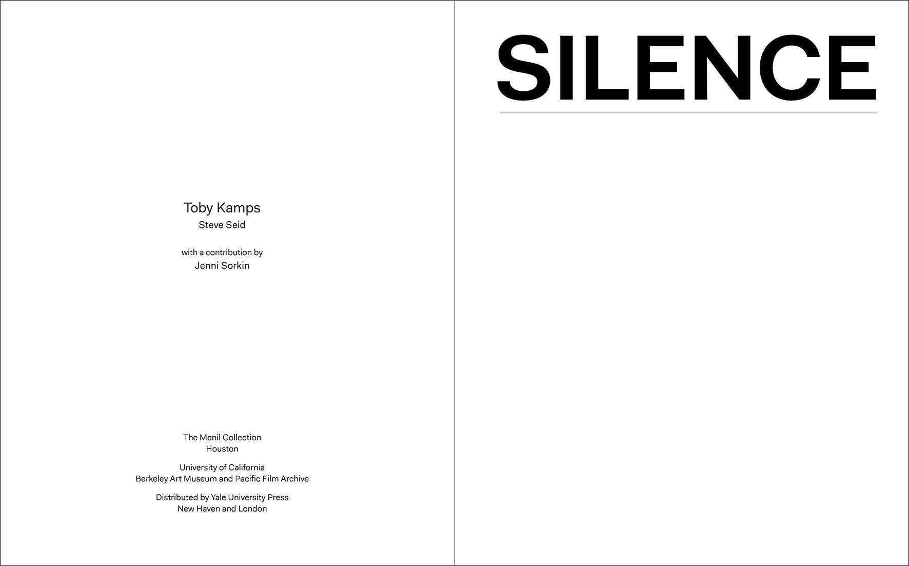 This catalogue examines the ways 29 artists have invoked silence to shape space and consciousness over the last century. The paintings, drawing, sculptures, installations, performances, and sound works included take silence as a subject matter or medium and explore it as symbol, memorial device, or oppressive force. It includes modern masters like Marcel Duchamp and Réne Magritte; artists who matured in the 1960s and ’70s such as Bruce Nauman and Marcel Broodthaers; documentation of Tehching Hsieh’s One Year Performance 1978–79; Andy Warhol’s Electric Chair paintings and Christian Marclay’s works based on the “Silence” sign depicted; and younger artists such as Jennie C. Jones and Jacob Kierkegaard. The essays examine not only silence in art, but also humanist approaches to the subject and its historical depiction and interpretation.